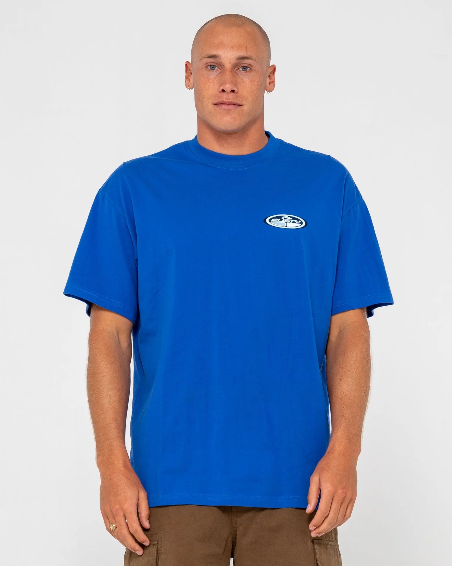 R2K Relaxed Tee With Rusty Chest And Sleeve Print. 100% Cotton Midweight Jersey