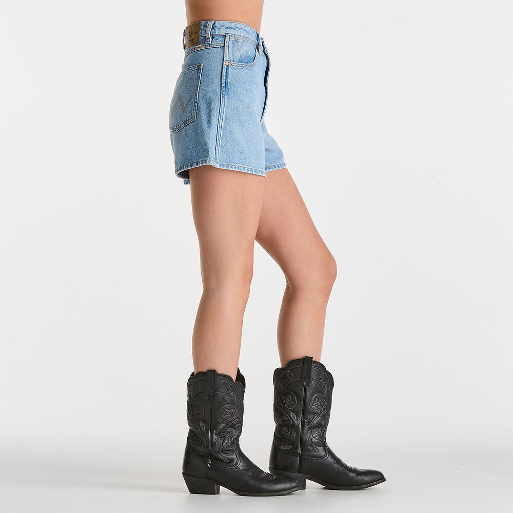 Our Hi Bells Short is a high rise, slim fit. Designed with a fitted top block, and A-line through the leg. Made in a vintage inspired mid-blue wash, in a soft non-stretch denim. Wear with the hem rolled for a cheekier length.