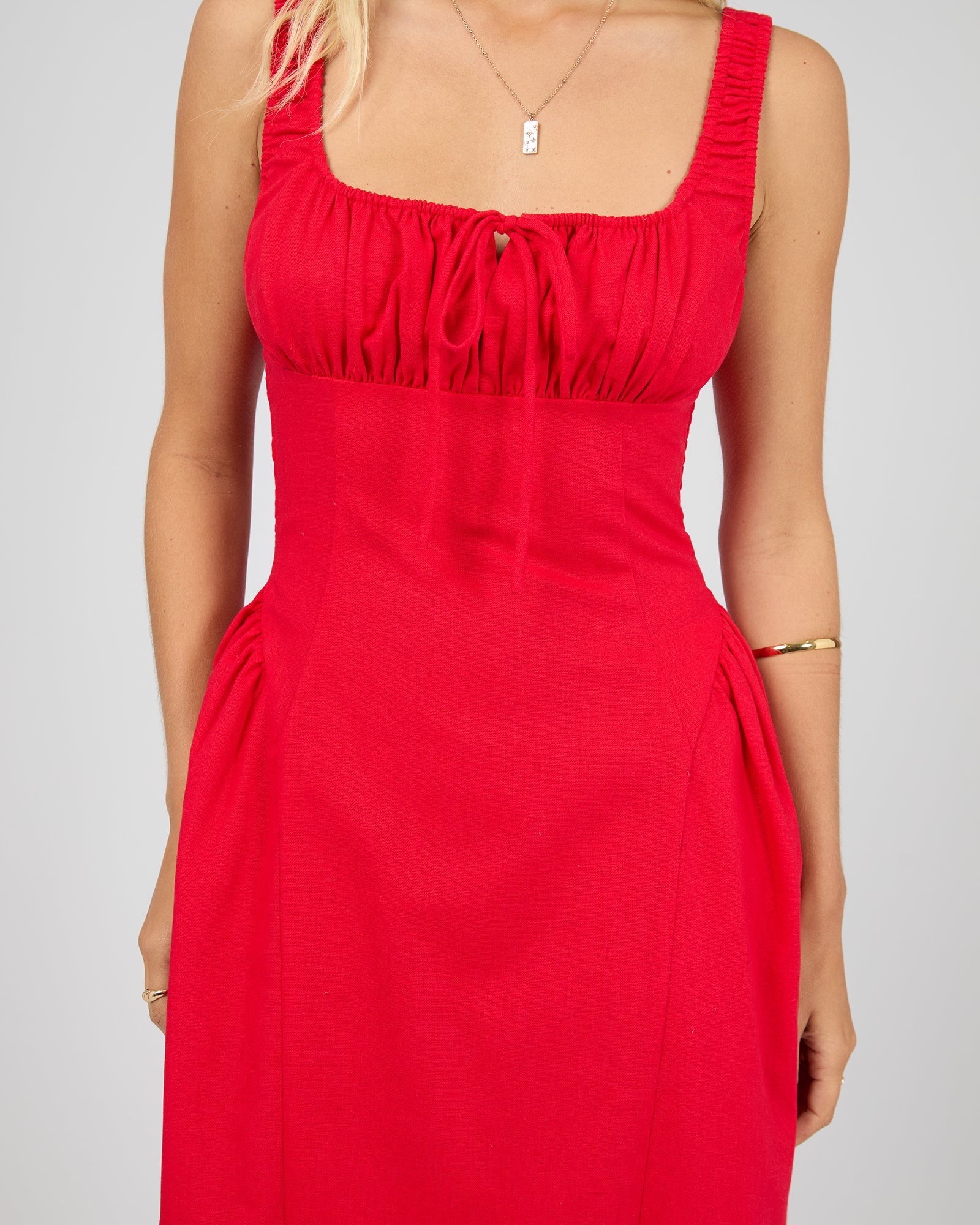 The Mavis Maxi Dress in red is a summer statement piece, blending ease with elevated detailing. The neckline features a functional tie detail, creating an adjustable fit, while elasticated armholes add subtle comfort, and the shirred back panel provides a flattering fit. Balancing effortless elegance with everyday versatility, the Mavis Maxi Dress will fit into every summer event with ease.