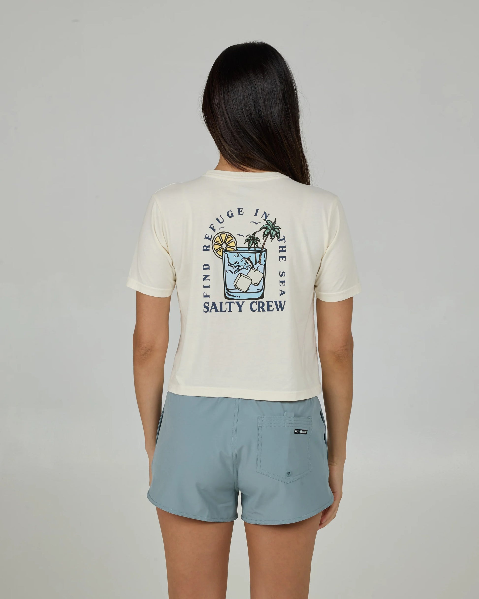 The Ocean Spray Crop Tee in Off White is a boxy, cropped tee featuring screen printed chest and back prints.