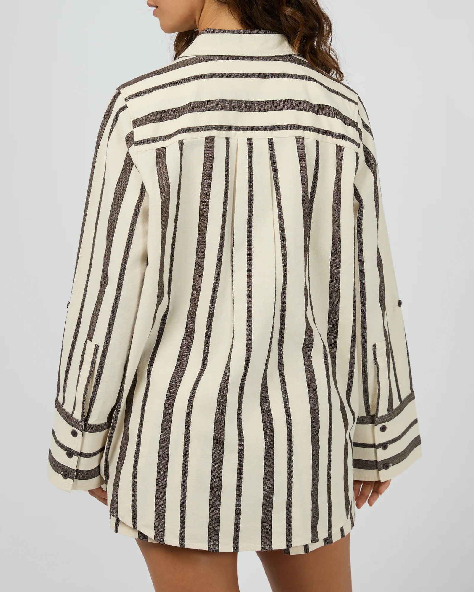 The Rosa Stripe Shirt is an easygoing essential, featuring warm brown stripes on a soft vanilla base with dark buttons down the front and on each cuff. Lightweight and relaxed, it’s perfect thrown over bathers or styled with the matching Rosa Stripe Shorts for an effortlessly coordinated look. A timeless layer for sun-soaked days.