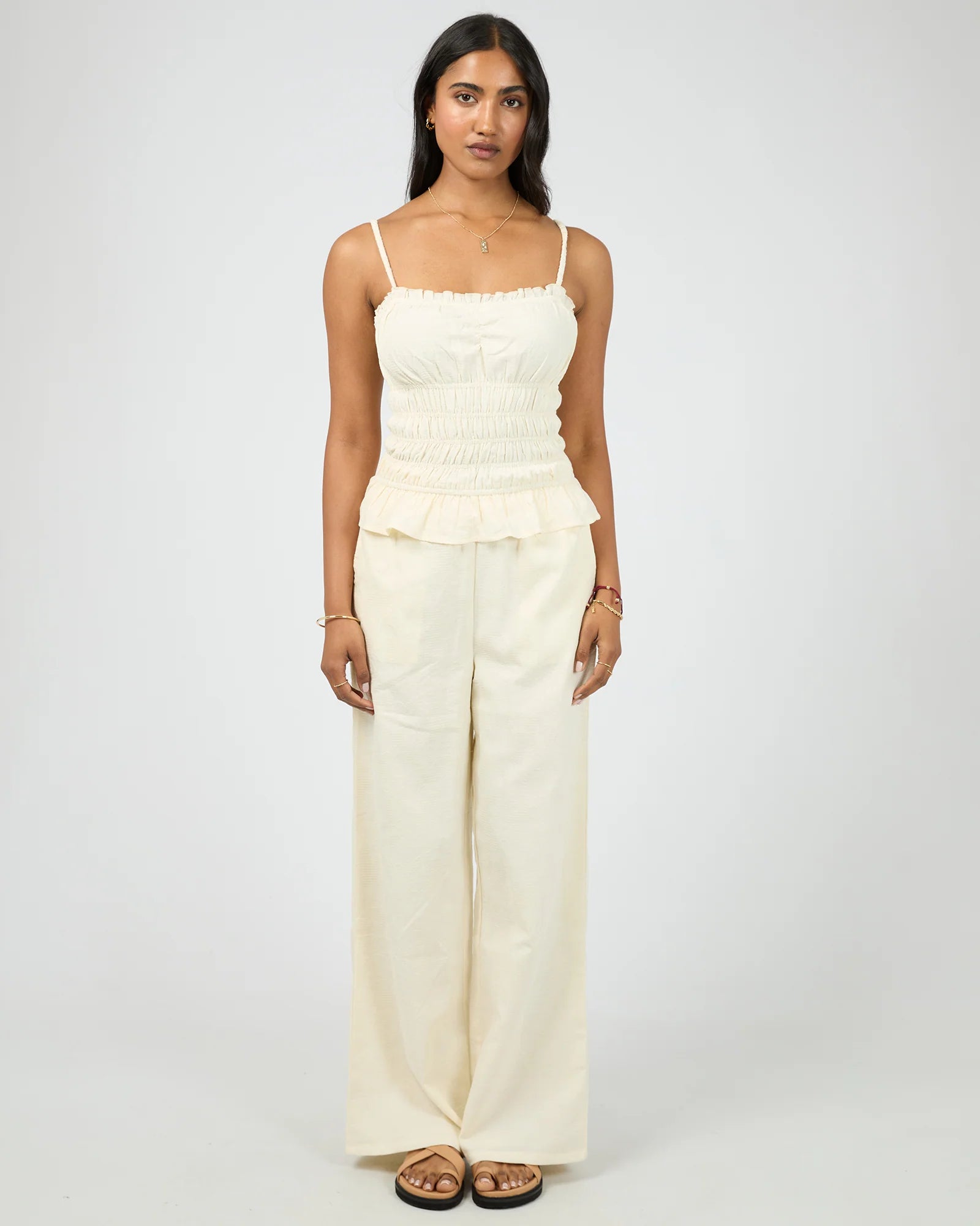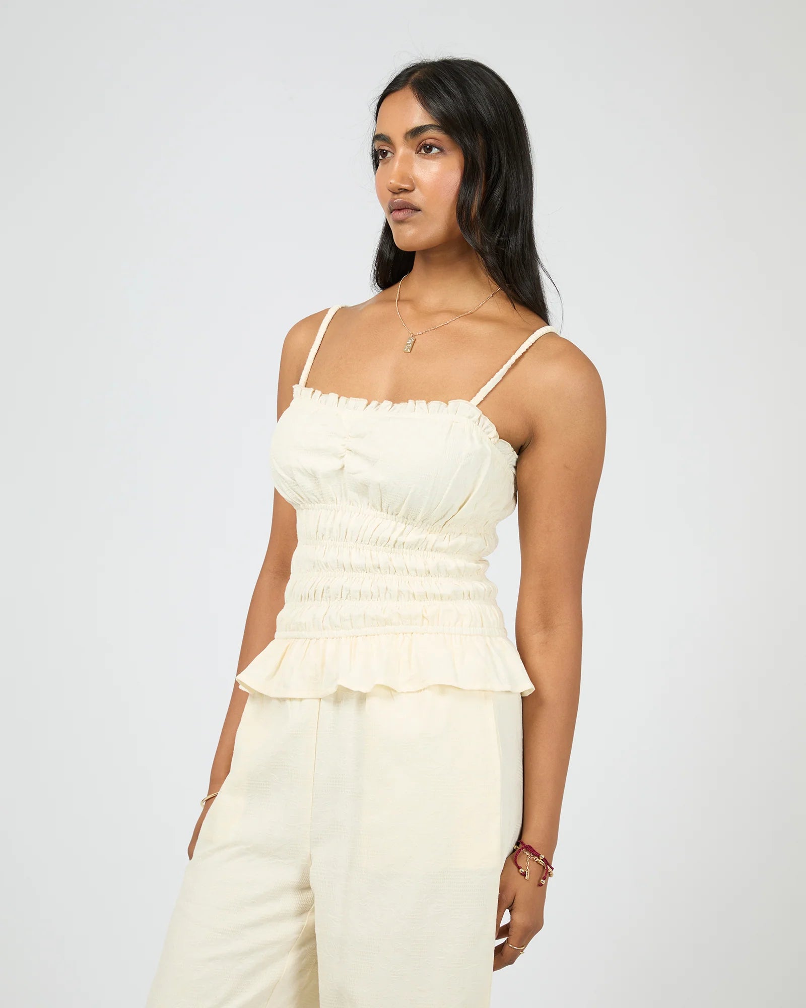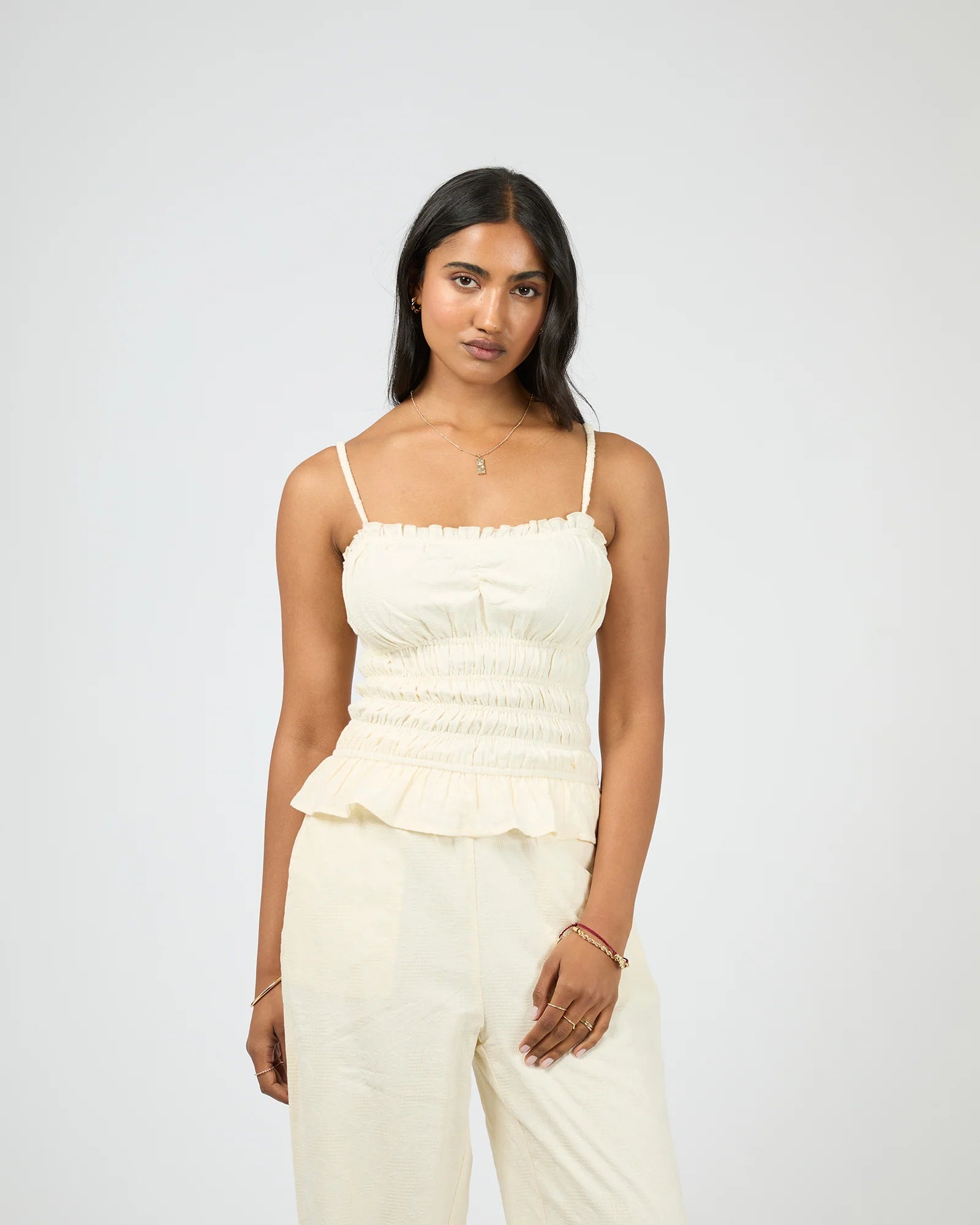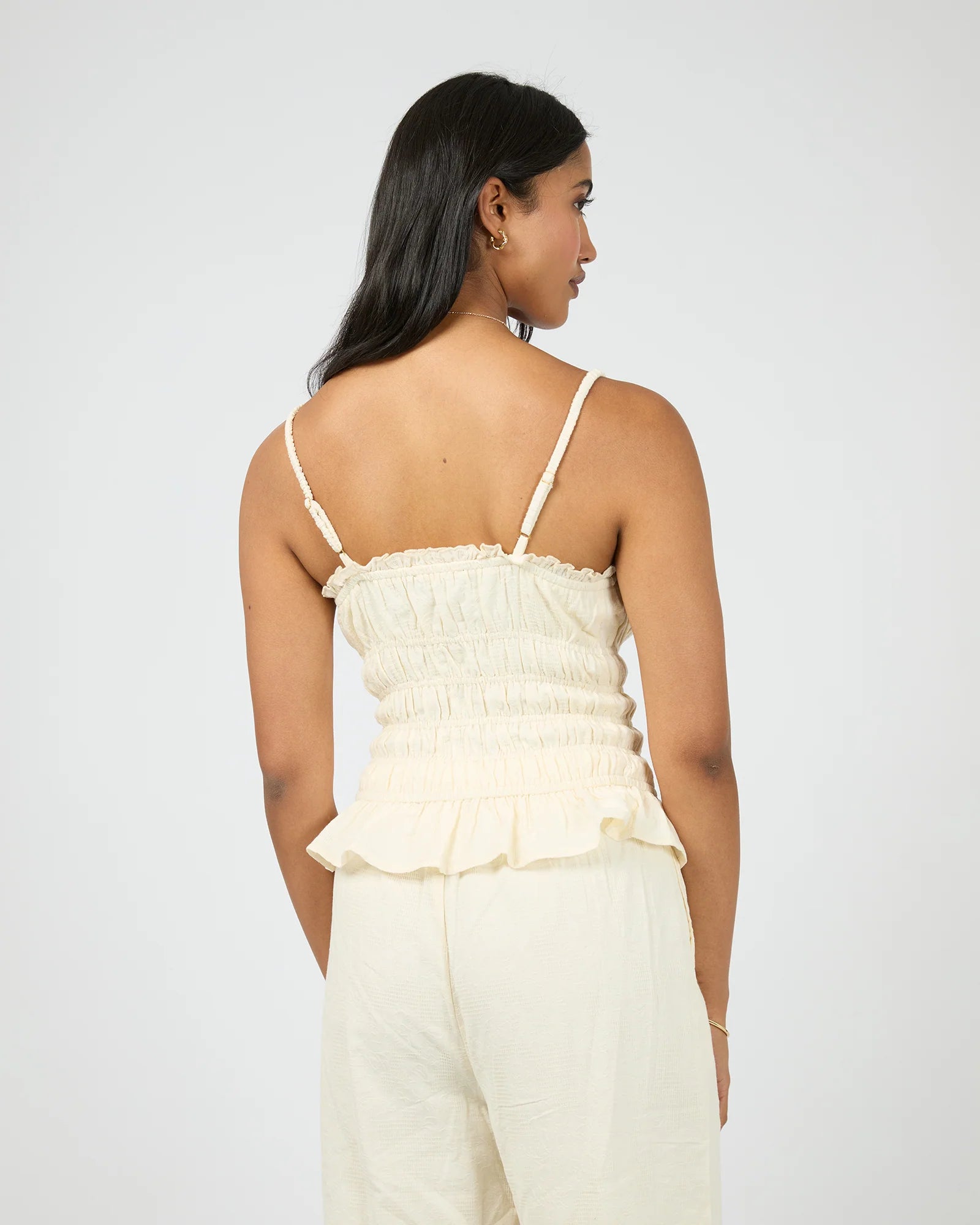 The Tropica Tank is a breezy summer essential with a playful, feminine twist. It features delicate gathers at the bust and a frilled top edge for a flattering silhouette. The shirred body offers gentle stretch, ensuring all-day comfort and ease. The Tropica Tank is perfect for sunny days and warm evenings—effortless on its own or paired with matching Tropica pieces.